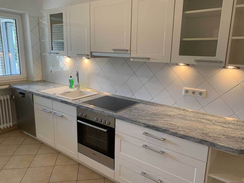 Links neben der Eingangstür befindet sich die geräumige Küche, die neben einer sehr eleganten Einbauküche in weißem Landhausstil mit indirekter Beleuchtung genügend Platz für einen Esstisch und zwei Stühle bietet. Bosch-Elektrogeräte wie die Spülmaschine, der Herd und das Ceranfeld garantieren sorglosen Kochgenuss. Die Kühl-Gefrierkombination wird Ihnen kostenfrei zur Nutzung überlassen. Durch die große Fensterfront der Küche können Sie praktischerweise gleich alles auf die Loggia hinaus reichen.