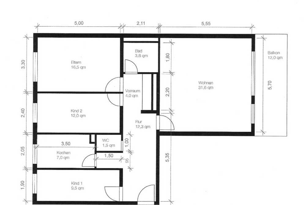 Die Wohnung verfügt über drei separate Schlafzimmer, ein Badezimmer mit Badewanne, sowie ein zusätzliches Gäste-WC, die Küche ist 7 m² groß.