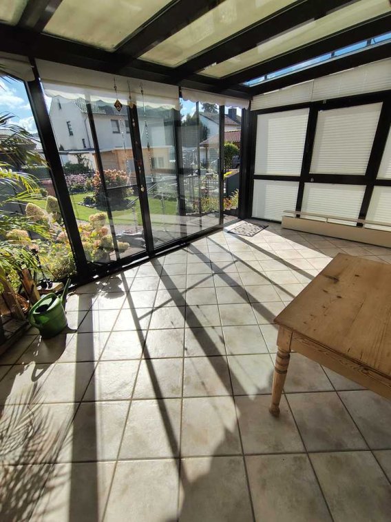 Ein gepflegtes Haus sucht Familie mit einem Kind. 2 Bäder und die 4 Zimmer verteilen sich auf 2 Etagen (eins davon ist ein Durchgangszimmer). Die Küche ist mit hochwertigen Geräten ausgestattet und mündet im klimatisierten Wintergarten. Markise auf dem Glasdach, Rollläden und Fliegengitter steigern den Komfort. Der Charme des Gebäudes wird durch eine großzügige Garage mit Hobbywerkstatt ergänzt.