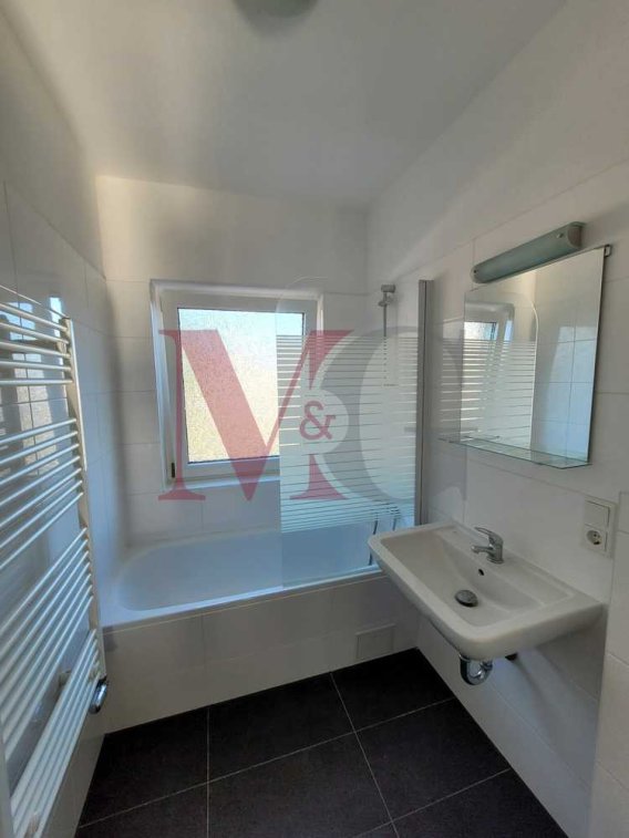 Das Tageslichtbad ist mit einer Badewanne ausgestattet und präsentiert sich mit modernen anthrazitfarbenen Bodenfliesen sowie weißen Wandfliesen.