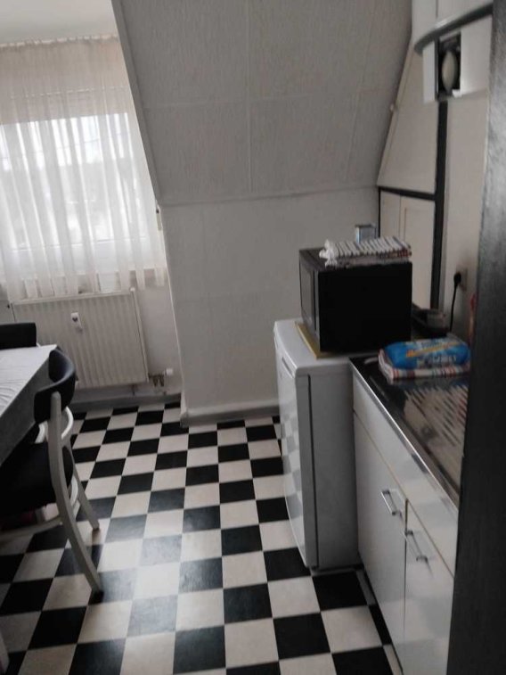 Die Zwei- Zimmer-Dachgeschosswohnung wurde vom Vormieter in gepflegtem Zustand gehalten. Das Tageslicht-Bad besteht aus WC, Waschbecken und Badewanne in freundlichem Beige. Zur Küche gehören ein Esstisch, zwei Stühle, Spüle, Hängeschrank und Elektroherd. Die Wohnräume sind mit Raufaser tapeziert. Wohnzimmer, Schlafzimmer und Flur sind mit Teppichböden ausgelegt.