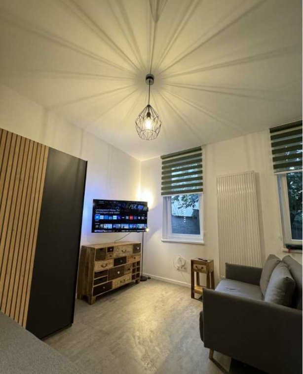 Auf ca. 32 Quadratmetern erwarten Sie ein großer harmonisch eingerichteter Raum: mit moderner Einbauküche und Essplatz, mit einem komfortablen Polsterbett, einem geräumigen Kleiderschrank, einem bequemen Sofa und einem funktionalen Arbeitsplatz mit Schreibtisch und Stauraum. Eine stilvolle Kommode und ein moderner Smart-TV runden das Ambiente ab.