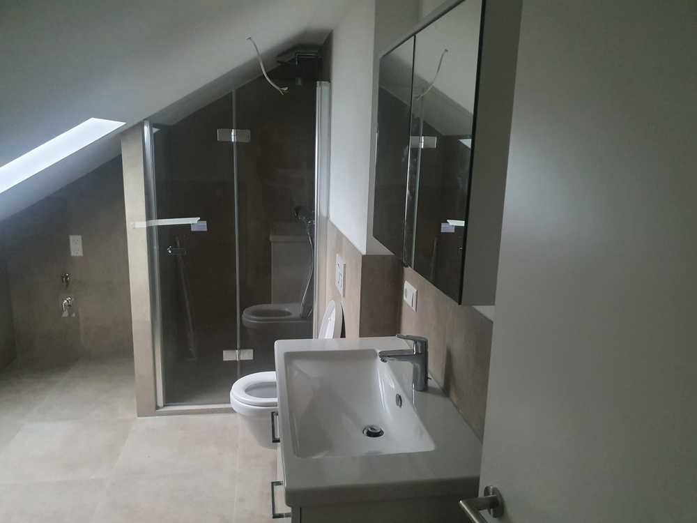 • Modernes Badezimmer mit Dusche, Waschmaschinenanschluss und Fenster