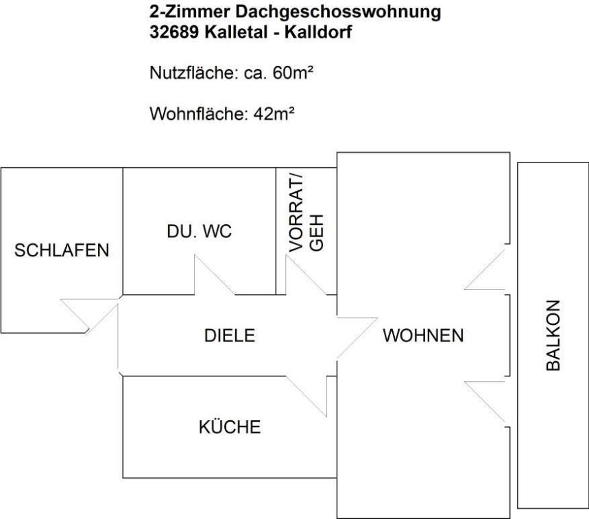 Die Nutzfläche der Wohnung beträgt etwa 60m². Aufgrund der Dachgeschosslage ergibt sich hieraus eine