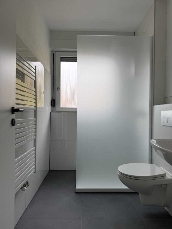Das Badezimmer überzeugt mit moderner Ausstattung, begehbarer Dusche und stilvollem Design.