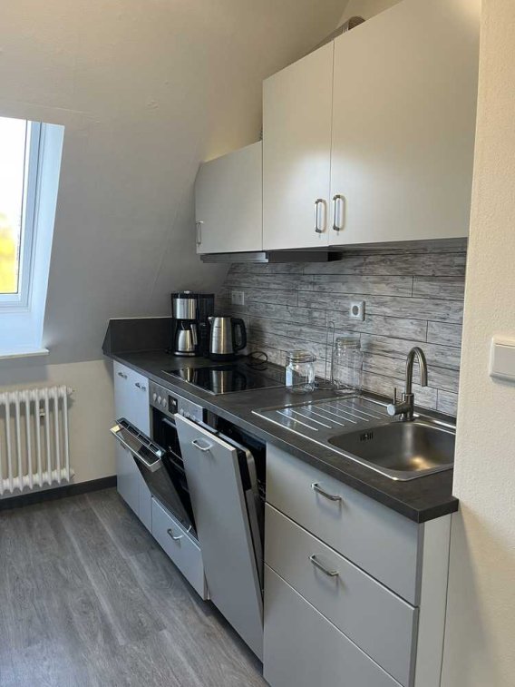 Die eingebaute Küche ist mit Elektrogeräten ausgestattet.