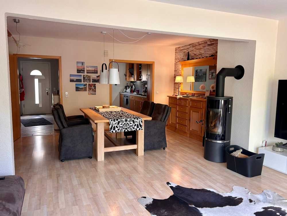 Ein besonderes Highlight ist der hochwertige Ofen der Marke Cera, der zentral im Wohnzimmer steht und den gesamten Wohnbereich angenehm beheizt.