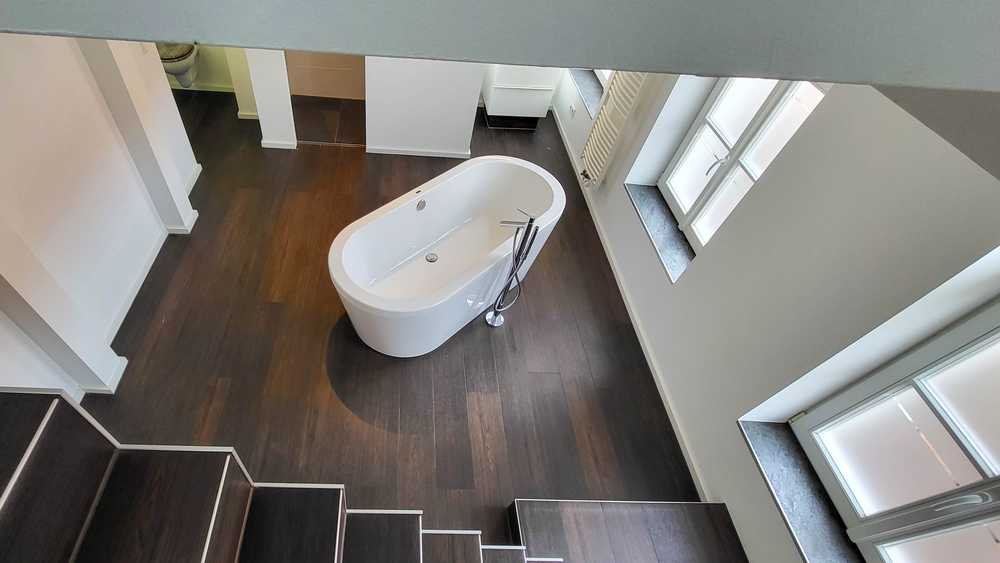 Ein Highlight: das außergewöhnliche Bad, welches die darüberliegende ganze Etage einnimmt und in deren Mitte die freistehende Badewanne thront!
