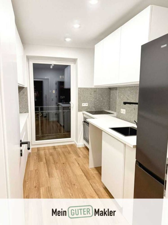 Direkt neben dem Bad liegt die Küche mit neuer weißer Einbauküche, ausgestattet mit sämtlichen Elektrogeräten inklusive großem Kühlschrank. Der Stellplatz für die Waschmaschine ist hier ebenfalls integriert. Besonders schön: Von der Küche aus gelangen Sie direkt auf den Balkon – perfekt, um den Morgenkaffee mit grünem Ausblick zu genießen oder abends entspannt den Tag ausklingen zu lassen.