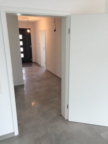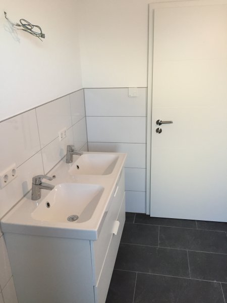 Die Bodenbeläge sind aus 80x80 cm Fliesen, Vinyl und Laminat. Das Badezimmer ist mit gr. Fenster, Badewanne, frei begehbare Dusche und Doppelwaschbecken ausgestattet. Ein Gäste-WC mit separater Dusche ist vorhanden.