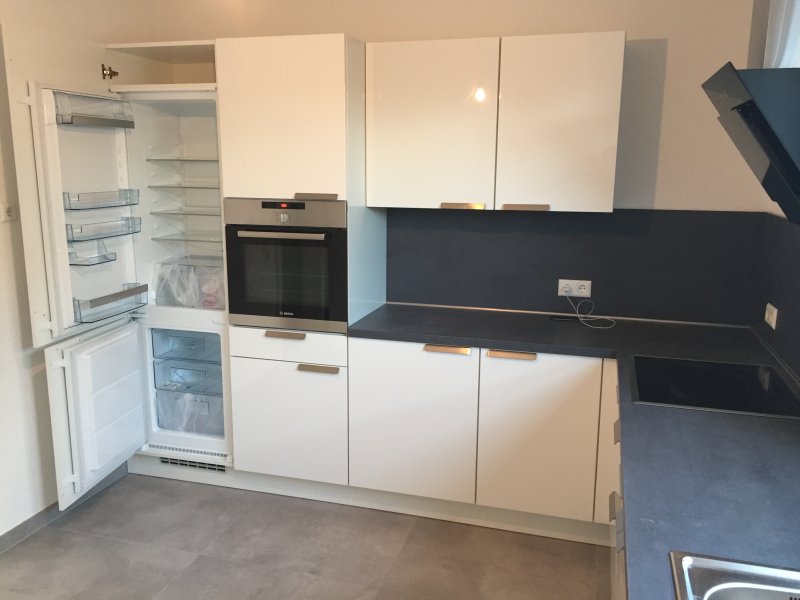 Zustand: gehoben, Großzügiger Wohn- und Essbereich mit Terrassenzugang beinhaltet angrenzend eine Küche. EBK in Weiß und Hochglanz mit allen (Bosch) Elektrogeräten. Kühl Gefrierkombination.