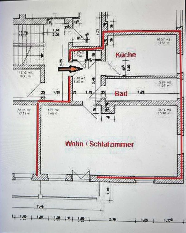 • Flur, Küche, Bad, großer Wohn-/Schlafraum mit Teilwand – Schlaf- und Wohnbereich klar getrennt (Wand ist mittig gezogen, auf Umriss noch nicht eingezeichnet)