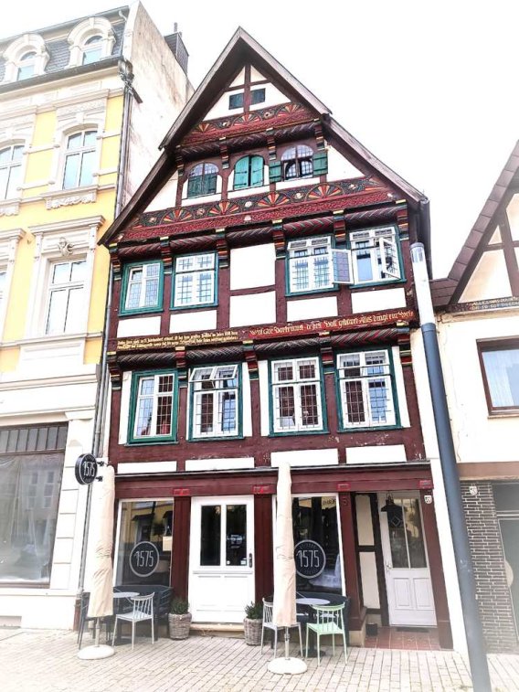 Das Haus befindet sich in attraktiver Innenstadtlage in Herford, direkt am Neuen Markt. Das denkmalgeschützte Gebäude von 1575 verleiht den Wohnungen auch im Innenraum einen besonderen Charme. So wurden beispielsweise die alten Deckenbalken aus Eiche aufwendig freigelegt, die als Gestaltungselement sichtbar sind.
