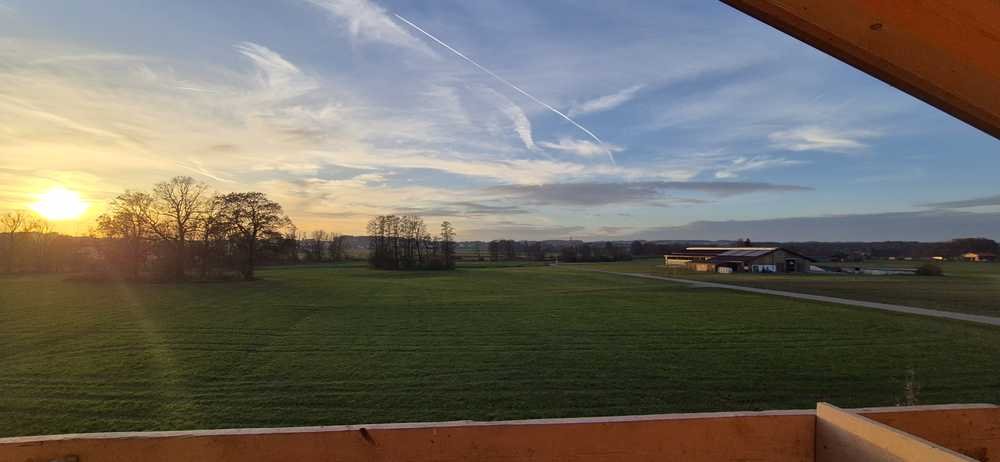 Die Wohnung befindet sich in einer Neubausiedlung, umgeben von Wiesen, Feldern und viel Grün.