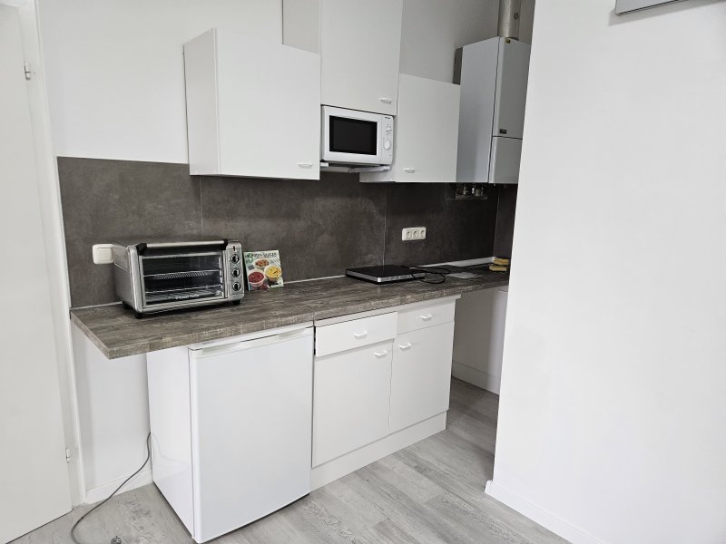 Singleküche mit Kühlschrank, Kochplatte, Mikrowelle, Mini-Backofen, Wasserkocher und kompletter Küchenausstattung