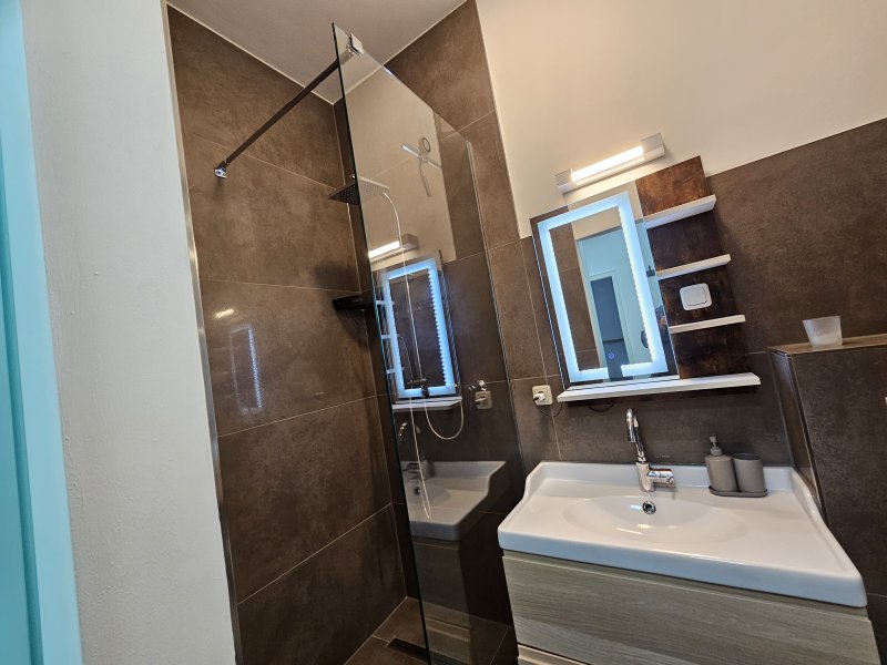Tageslichtbad mit moderner Walk-in-Dusche, Waschtisch und WC