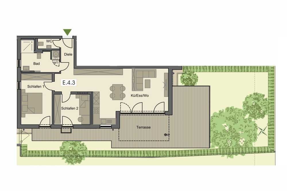 Die nach Südwesten ausgerichtete Anlage überzeugt durch einen unverbaubaren Blick ins Grüne und eine durchdachte Architektur: Erdgeschosswohnungen verfügen über großzügige Terrassen mit Gartenanteil, im Obergeschoss laden überdachte Balkone zum Entspannen ein, und im Dachgeschoss stehen weitläufige Dachterrassen zur Verfügung.