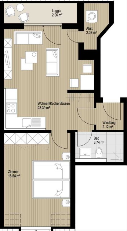 Der großzügige Wohn-, Koch- und Essbereich (ca. 23 m²) ist das Herzstück der Wohnung. Hier sorgt die neue Einbauküche für modernen Komfort, und der Zugang zur Loggia lädt zu entspannten Stunden im Freien ein. Das Schlafzimmer bietet mit ca. 16,5 m² ausreichend Platz für ein Doppelbett und zusätzlichen Stauraum.