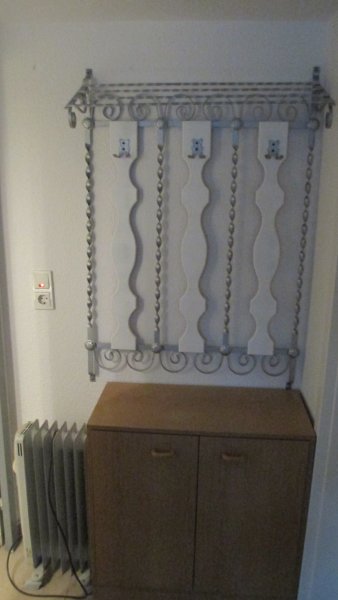 Zum Inventar der Wohnung gehören: Kühlschrank mit Eisfach, Bett, Kleine Essecke, Kleiderschrank, und eine an der Wand angebrachte Garderobe