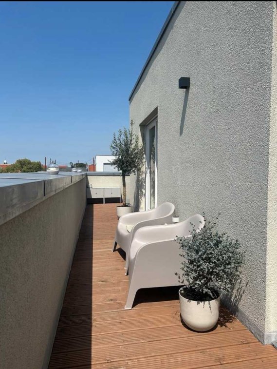 Außerdem ist sie ausgestattet mit einer Einbauküche und Fußbodenheizung und bietet einen traumhaften Ausblick durch die große Dachterrasse.