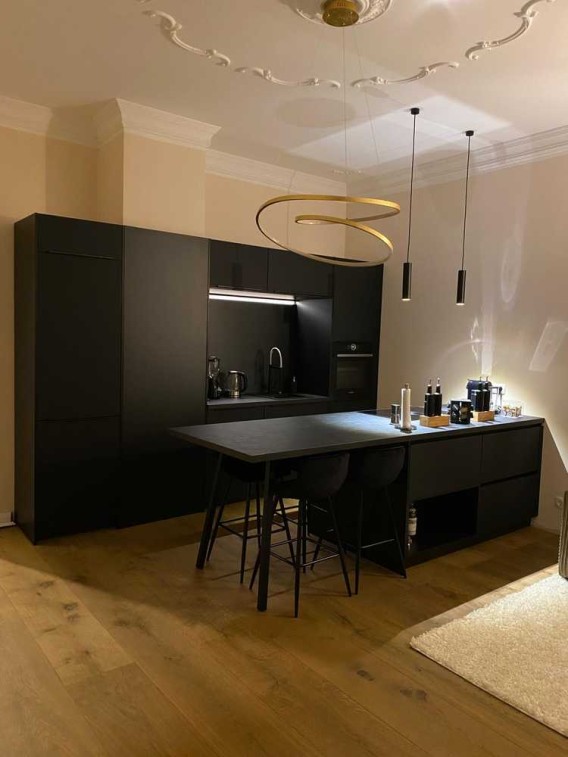 Moderne, mattschwarze Einbauküche mit Anti-Fingerprint-Oberflächen. BORA-Induktionskochfeld mit integriertem Dunstabzug, BOSCH Backofen, Spülmaschine, Kühl- und Gefrierschrank. Viel Arbeitsfläche, lange Theke mit 4 Hockern (ideal als Arbeitsplatz). Komplett ausgestattet mit gängigen Küchengeräten und vollständig bestückt.