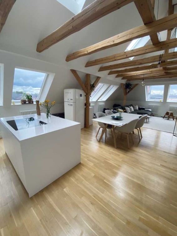 Diese nahezu neuwertige 3,5-Zimmer-Wohnung mit rund 120 m² Wohnfläche befindet sich im 4. Obergeschoss eines sehr gepflegten Mehrfamilienhauses aus dem Jahr 1904. Die Wohnung wurde 2015 ausgebaut und präsentiert sich in hervorragendem Zustand. Sie zeichnet sich durch ein offenes Raumkonzept aus, in dem teilweise beeindruckende Deckenhöhen von bis zu 4,5 Metern ein außergewöhnlich großzügiges Wohngefühl schaffen.