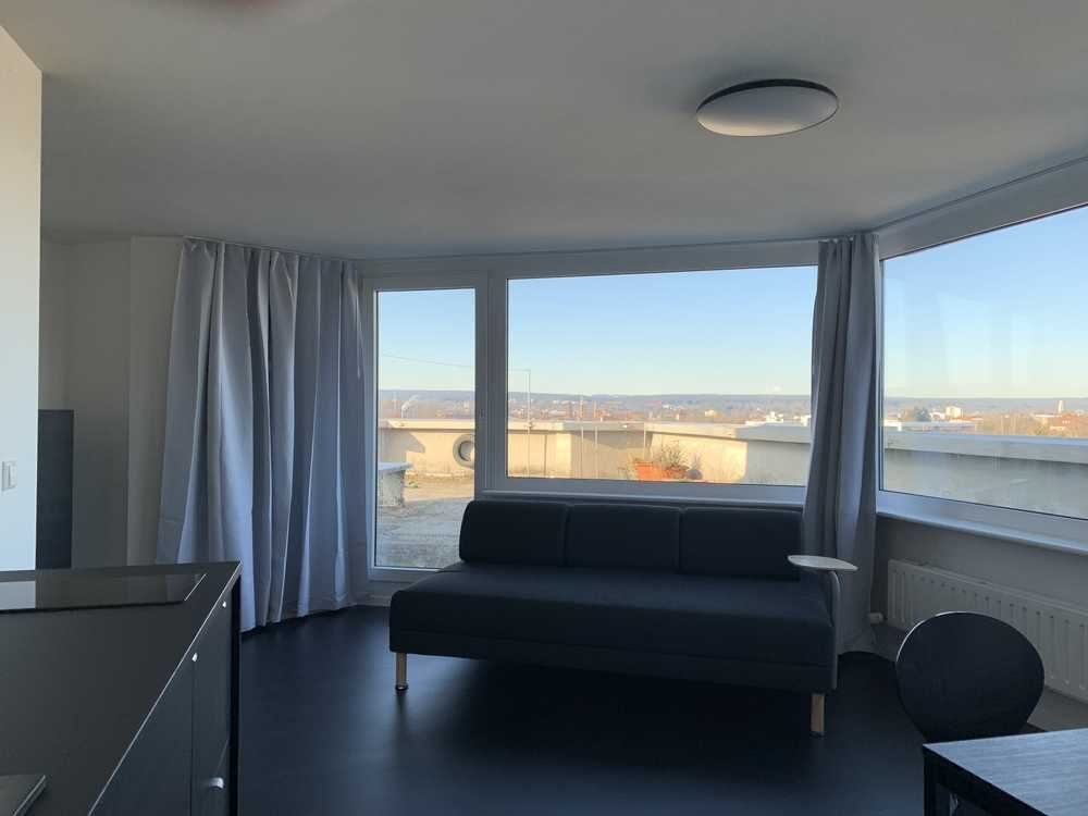 Das kleine Penthouse Studio verfügt über ein Zimmer mit Kochzeile und Duschbad. Das Studio bietet über ein Fensterband den Blick auf das Panorama des Schwarzwald Baar Kreises. Die Dachterrasse steht mit einem Anteil von ca. 50 qm dem Mieter zur Verfügung.