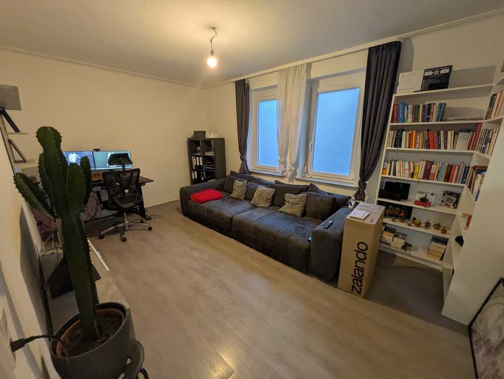 Die Wohnung ist eine gut geschnittene 2-Zimmer-Wohnung mit kleinem Flur und zwei großzügigen Räumen, die flexibel als Wohn- oder Schlafzimmer genutzt werden können.