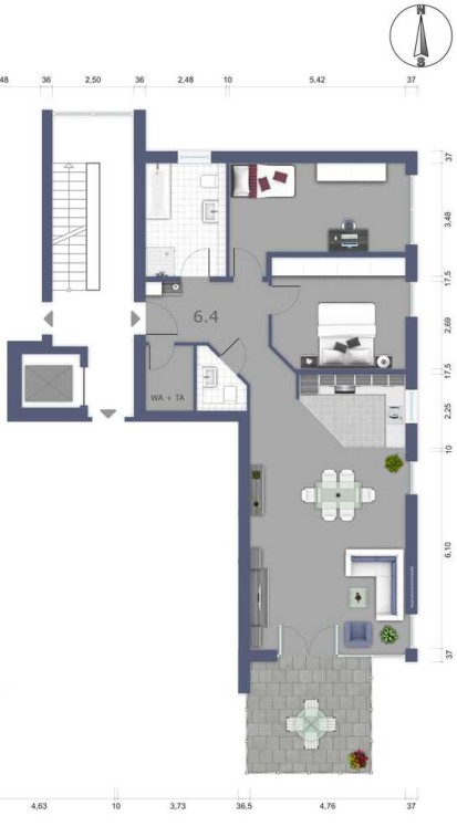 Die an den Wohnbereich angrenzende quadratisch angelegte Loggia in Südwest-Ausrichtung (ca. 13 m²) ermöglicht genussvolle Stunden im Freien.