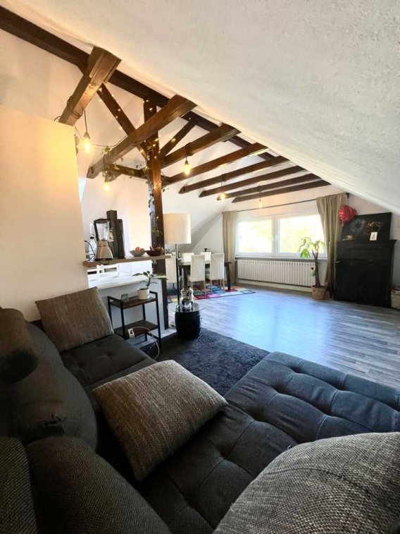 Die Wohnung überzeugt durch ihre angenehme Raumaufteilung, offene Decken mit sichtbaren Balken und eignet sich ideal für Singles oder Paare.