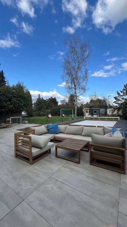 Dieses traumhafte Einfamilienhaus empfängt Sie mit einem einladenden Bereich zur offenen Küche mit dem Essbereich und auch zum Wohnzimmer. Im Erdgeschoss befindet sich noch ein Gäste-WC. Vom Essbereich gelangt man auf die gemütlich und modern gestaltete Terrasse mit den großen grauen Steinbodenfliesen und Lounge-Bereich. Das große Grundstück mit Aussenpool (beheizbar) und Sauna laden zum Entspannen ein und ist für Ruhesuchende eine optimale Erholung.