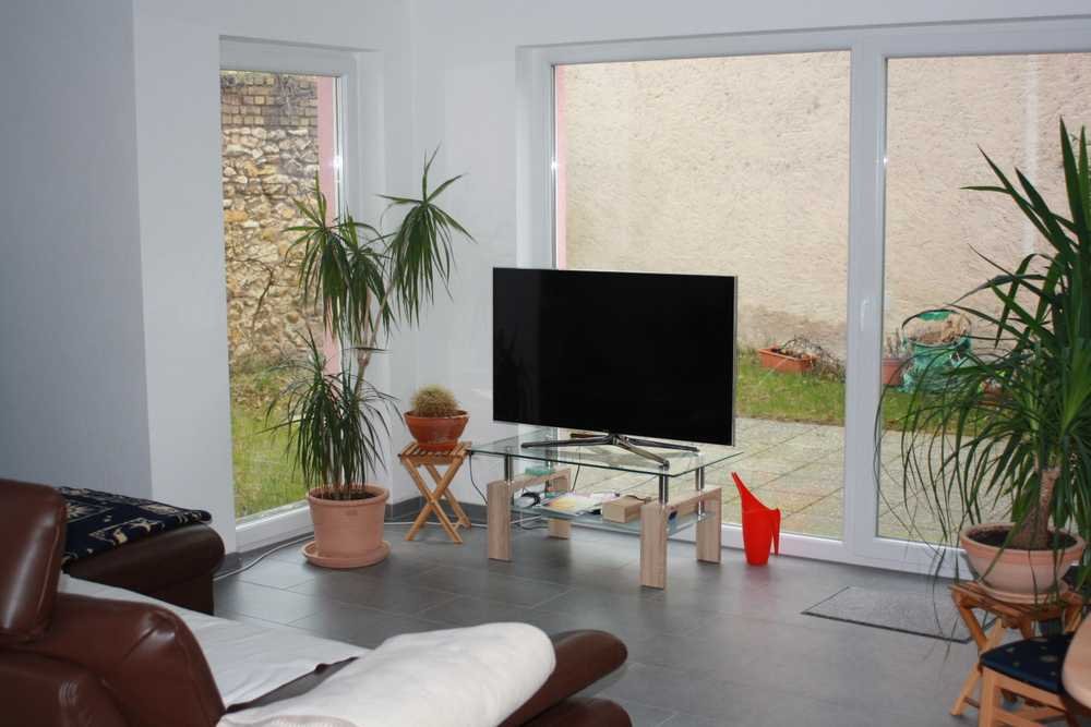 Einliegerwohnung mit Terasse, Garten, Bad, Einbauküche, Wohnzimmer, Schlafzimmer und Abstellraum.