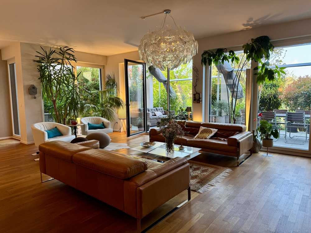 Vom Hausflur aus gelangt man direkt in das lichtdurchflutete Wohnzimmer mit exklusiver, offener Küche und Blick auf die wunderschön angelegte Gartenterrasse. Der ideale Ort zum Entspannen, Kochen oder Freunde einladen. Vom Wohnzimmer aus gelangt man über einen kleinen Flur zu drei weiteren Zimmern, die als Schlafzimmer, Gästezimmer oder Büro genutzt werden können. Ganz besonders charmant ist es, dass man von allen Zimmern aus auf die Terrasse gelangen kann. Die Terrasse geht nahezu um die gesamte Wohnung, ist wunderschön begrünt, verfügt über eine Lounge-Ecke, einen Essbereich und für BBQ-Liebhaber auch einen BBQ-Bereich. Auf der Terrasse lässt es sich herrlich bei einem Kaffee in den Tag starten oder den Tag bei einem Gläschen Wein perfekt ausklingen.