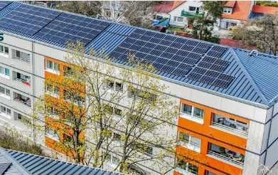 • Neu eingedeckte und gedämmte Dächer mit Photovoltaik-Modulen, deren erzeugter Strom direkt für den Betrieb der Wärmepumpen genutzt wird
