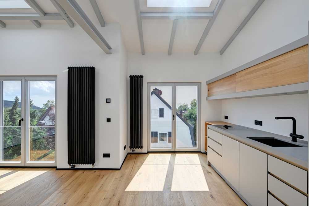 Die kombinierten Schlaf- und Badezimmer beeindrucken alle mit maßangefertigten, rahmenlosen Duschen von Sprinz sowie hochwertigen Elementen von Dornbracht und Duravit. Einbauschränke und Einbauküchen von Morgen Interiors mit Geräten von Siemens und Bora bieten auf allen Wohnebenen die perfekte Symbiose von Funktionalität und Stil. In die Küchen integriert sind jeweils eigene Waschmaschinen. Geölte, wunderschöne Hartholz-Eichendielen verleihen allen Wohnungen eine sehr warme Wohlfühlatmosphäre und machen das Barfußlaufen zu einem ganz besonderen Genuss. Die doppelt verglasten Vollholzfenster im ganzen Haus sowie die teilweise bodentiefen Fensterelemente führen dazu, dass alle Wohnungen hell und lichtdurchflutet sind. Alle Innenwände sind in moderner Weise mit Malervlies gestaltet und in hellen Farben gehalten. Insgesamt ist die Farbgestaltung der Wohnungen in harmonischer Weise gewählt und sehr gefällig.