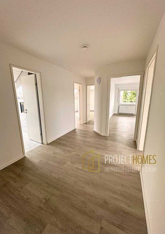 Beim Betreten der Wohnung empfängt Sie ein heller, großzügiger Flur, der alle Räume miteinander verbindet und sofort ein Gefühl von Weite vermittelt. Auf der rechten Seite befindet sich das gemütliche Schlafzimmer, das ausreichend Platz für ein großes Bett sowie Schrankflächen bietet. Gegenüber liegt das Tageslichtbad mit Dusche.