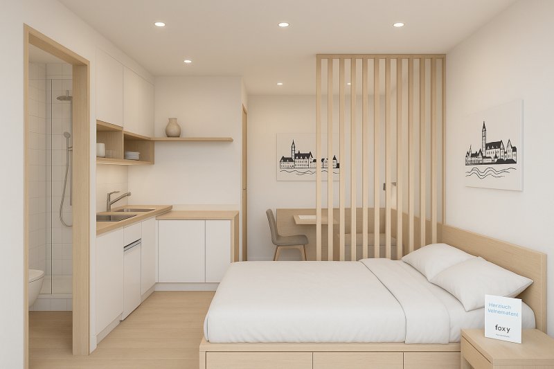 Die foxy studios sind wohnfreundlich und stilvoll eingerichtet mit Garderobe, Wohn/Ess-, Arbeits-, Schlafbereich, Ankleide, Badezimmer und smarten Stauräumen. Zu jedem Studio gehört ein eigener Parkplatz.