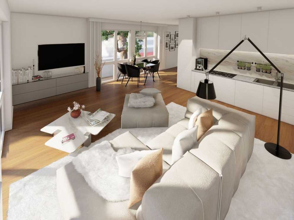 Auf der 1. Ebene im 1. Obergeschoss betritt man den weitläufigen Wohnbereich mit Wohn- / Esszimmer und Küche. Der dem Wohnbereich angegliederte Balkon ist nach Süden ausgerichtet. Das ebenfalls auf dieser Ebene liegende, großzügige Hauptbad ist mit bodenebener Dusche und Badewanne, Waschtisch und WC ausgestattet. Ein Abstellraum befindet sich auch auf dieser Ebene.