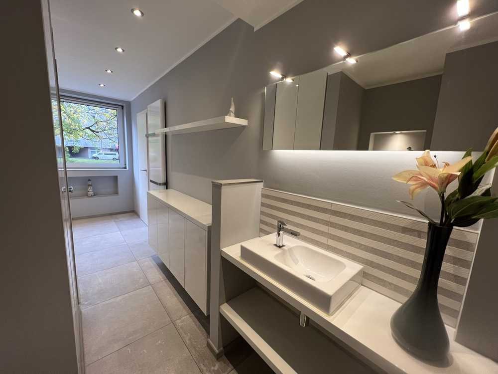 Das Badezimmer wurde vor wenigen Jahren aufwendig saniert. Es überzeugt mit einer hochwertigen Ausstattung: zwei Waschbecken, ein Einbauschrank sowie eine großzügige, ebenerdige Dusche sorgen für Komfort und klares Design. Zusätzlich gibt es Accessoires, wie ein in der Wand integriertes Radio.