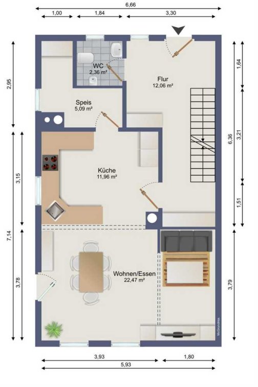 • Erdgeschoss: großzügiger Flur, heller Wohn-/Essbereich mit offener Küche, Kaminofen und angrenzender Speis, Gäste-WC