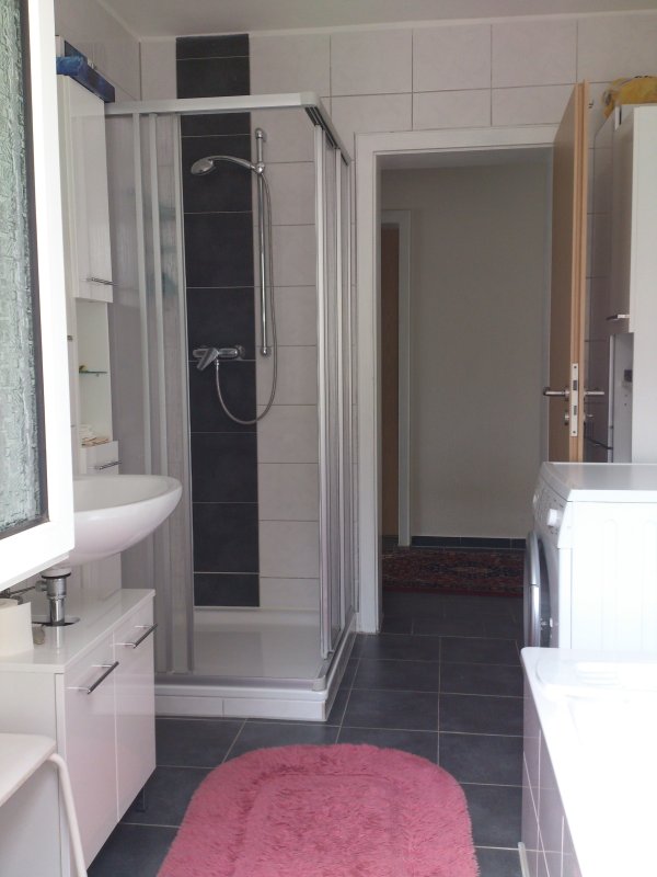 Diese helle über 85 m2 große 3,5-Zimmer-Wohnung befindet sich im Erdgeschoss eines gepflegten, in 2011 modernisierten Zweifamilienhauses in unmittelbarer Nähe zum Stadtzentrum. Neben einem Wohn- und Esszimmer (22 und 9 qm), einer Küche (9 qm), dem Schlafzimmer (16 qm) und einem Kinderzimmer/Büro (7 qm) verfügt diese Wohnung im Souterrain über einen weiteren beheizten großen Hobbyraum/Gästebereich (22 qm) mit weiß gefliestem kleinem Duschbad und Tageslicht. Zusätzliche Abstell- und Arbeitsfläche bieten ein eigener Kellerraum sowie der gemeinschaftlich genutzte Wasch- und Trockenraum. Das Badezimmer im Erdgeschoss (11 qm) ist mit grauen und weißen Fliesen gestaltet und lässt mit Wanne, Dusche, WC und Waschbecken - natürlich mit Fenster, keine Wünsche offen. Wohn-, Schlaf- und Kinderzimmer sind mit hochwertigen Laminatböden ausgestattet, alle übrigen Wohnbereiche sind gefliest.