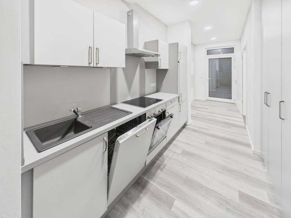 Badezimmer ins Auge, das mit einer großen, ebenerdigen Dusche, hochwertigen Armaturen sowie Fußbodenheizung ausgestattet ist. Ein direkter Zugang zum geräumigen Abstellraum bietet zusätzlichen Komfort und schafft wertvollen Stauraum. Aus dem Badezimmer gelangt man in den Wohnbereich, wo eine moderne Einbauküche mit hochwertigen, integrierten Geräten auf Sie wartet. Gegenüber der Küche befinden sich passgenau eingebaute Wandschränke, die erstaunlich viel Platz bieten und eine clevere Lösung zur optimalen Nutzung des vorhandenen Wohnraums darstellen.