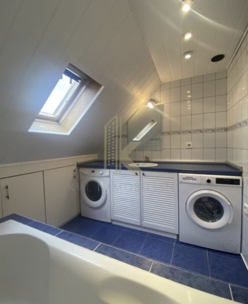 Das Badezimmer ist ausgestattet mit einer Badewanne sowie einer Waschmaschine und einem Trockner. Wandschränke bieten praktischen Stauraum. Zusätzlich gibt es ein separates WC.