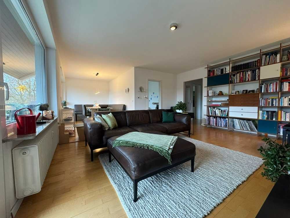 Die Wohnung verfügt über einen großzügen, hellen und offenen Wohn-Essbereich mit Zugang zum Balkon und Blick in den großen Garten.
