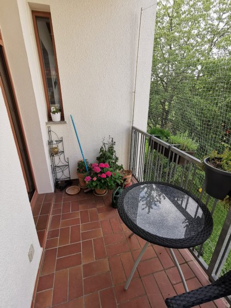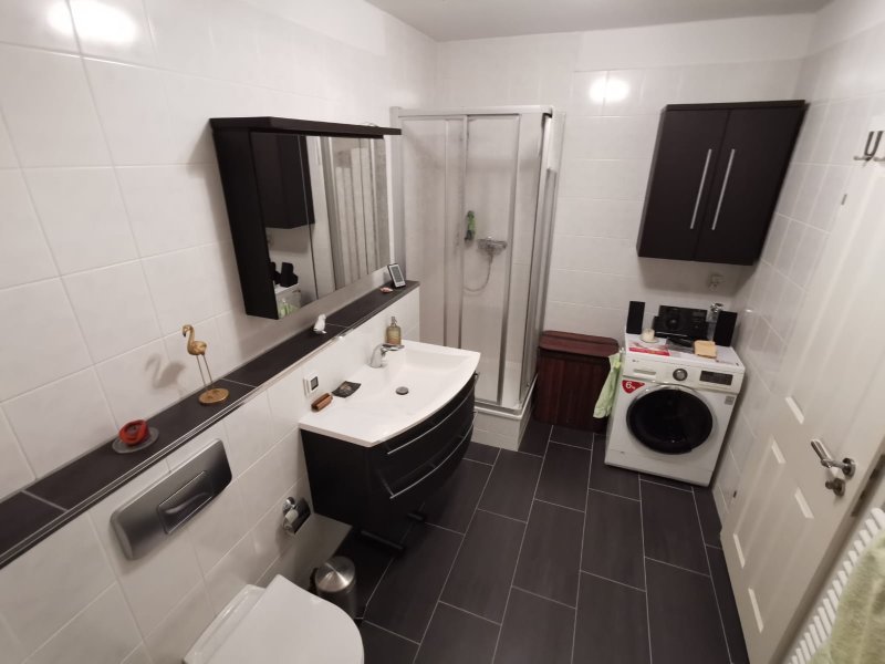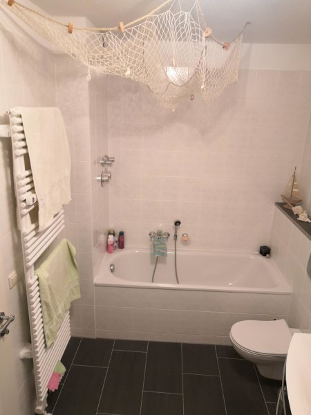 Die Wohnung ist bis auf Bad und Küche, die gefliest sind, mit Laminat ausgestattet.