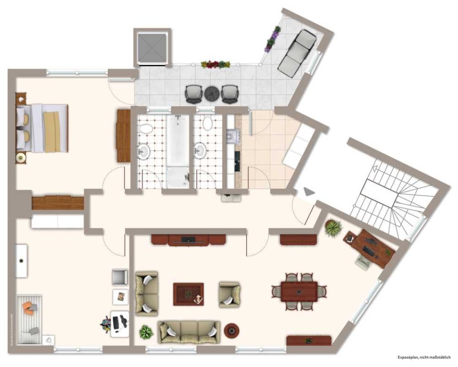 Auf der Ebene im 2. OG befindet sich noch ein kleines Apartment ( ca. 12 m², Bad, Mini-Küche) , z. zt. unrenoviert, das bei Bedarf separat dazu gemietet werden könnte. z.b. Büro, Kind etc. Kein muss.