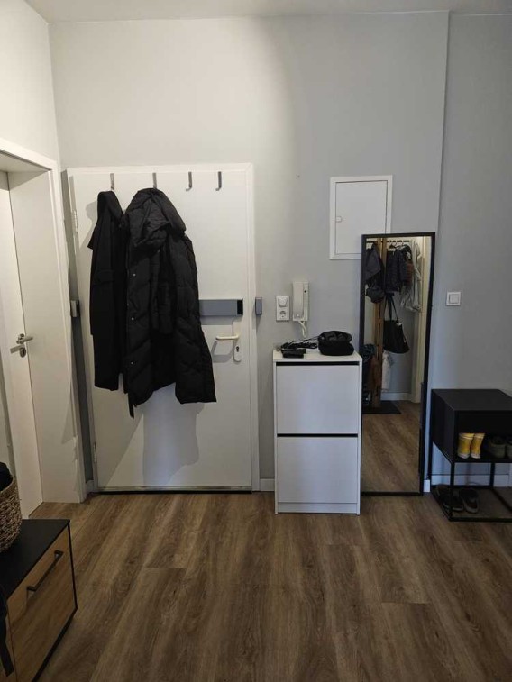 Beim Betreten der Wohnung befindet man sich in einem geräumigen Entrée. Dieser bietet Platz für Stauraum, Schuhschrank, Garderobe oder auch Dekoration. Links davon befindet sich das moderne Tageslicht-Badezimmer. Die Küche ist mit weißen Designer-Einbauten ausgestattet inkl. TV.