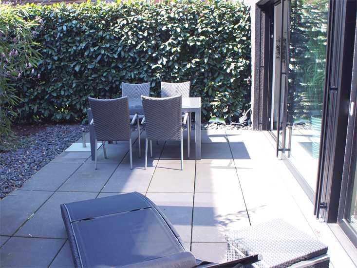 Die Gartenterrasse ist in sich abgeschlossen und schwellenlos über Schiebetüren im Wohn- bzw. Schlafzimmer zugänglich.