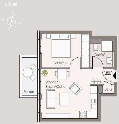 Die Wohnung besticht durch ihre hochwertige Ausstattung. In der gesamten Wohnung sind ein hochwertiger Vinylboden in Eichenparkettoptik sowie in Bad und Flur graue, großformatige Fließen verlegt. Die Wohnung besteht aus einem Bad mit großer, bodenebener Dusche und Toilette, einem Schlafzimmer, dem Abstellraum und dem großen Wohn-Essbereich mit offener Küche. Von hier gelangt man auf den Balkon mit Blick auf den Innenhof. Im Wohn- Essbereich besteht zusätzlich die Möglichkeit, einen Arbeitsplatz einzurichten.
