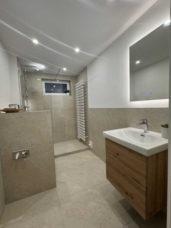Das neue Badezimmer mit Fußbodenheizung, fast ebenerdiger Dusche und Deckenspots bietet Ihnen Wellness-Atmosphäre vom Feinsten.